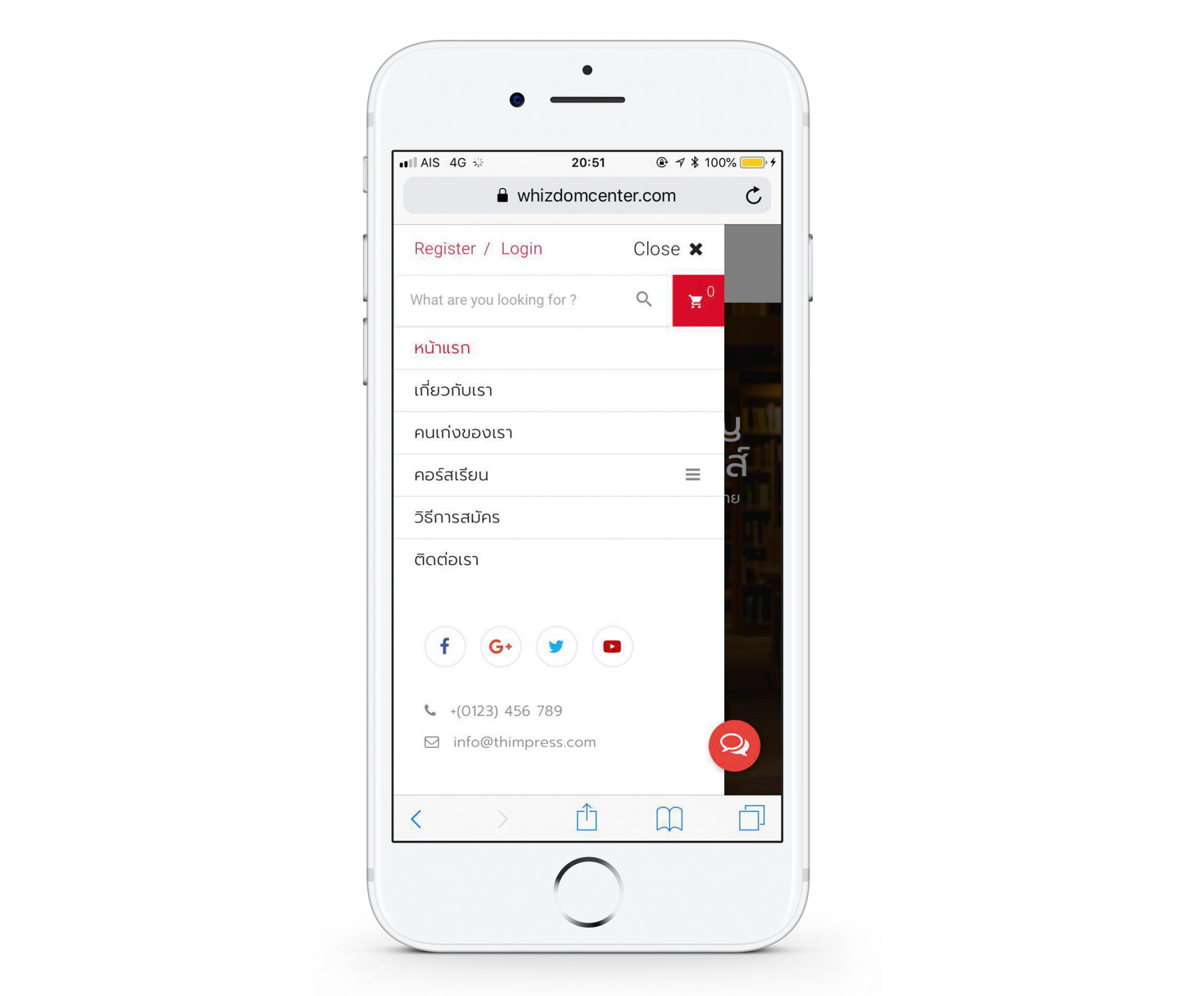 การแสดงผลบนจอโมบาย รูปแบบเมนู จะมีการเลื่อนออกมาจากด้านข้าง และ มีรายละเอียดของเมนู และ ค้นหา